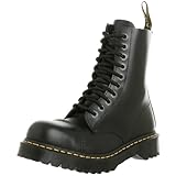 Dr. Marten's smooth black leather lace-ups feature a thick foam padded collar and tongue,a contoured foot-bed for exceptional fit and flexibility and a thick out-sole that reduces foot and body stress. Decorative seaming bisects the vamp, and the highly recognizable yellow stitching encircles the sole. A favorite style across many age groups, these boots coordinate with everything from jeans and Carharrt work pants to biker bar attire.